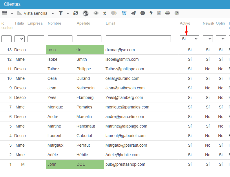 Para exportar una lista completa de todos sus clientes activos, utilice el filtro 'Activo' seleccionando 'sí'.