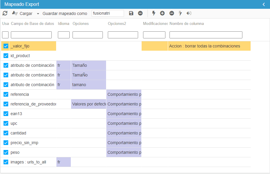 El mapping de su exportación deberá incluir los campos siguientes: