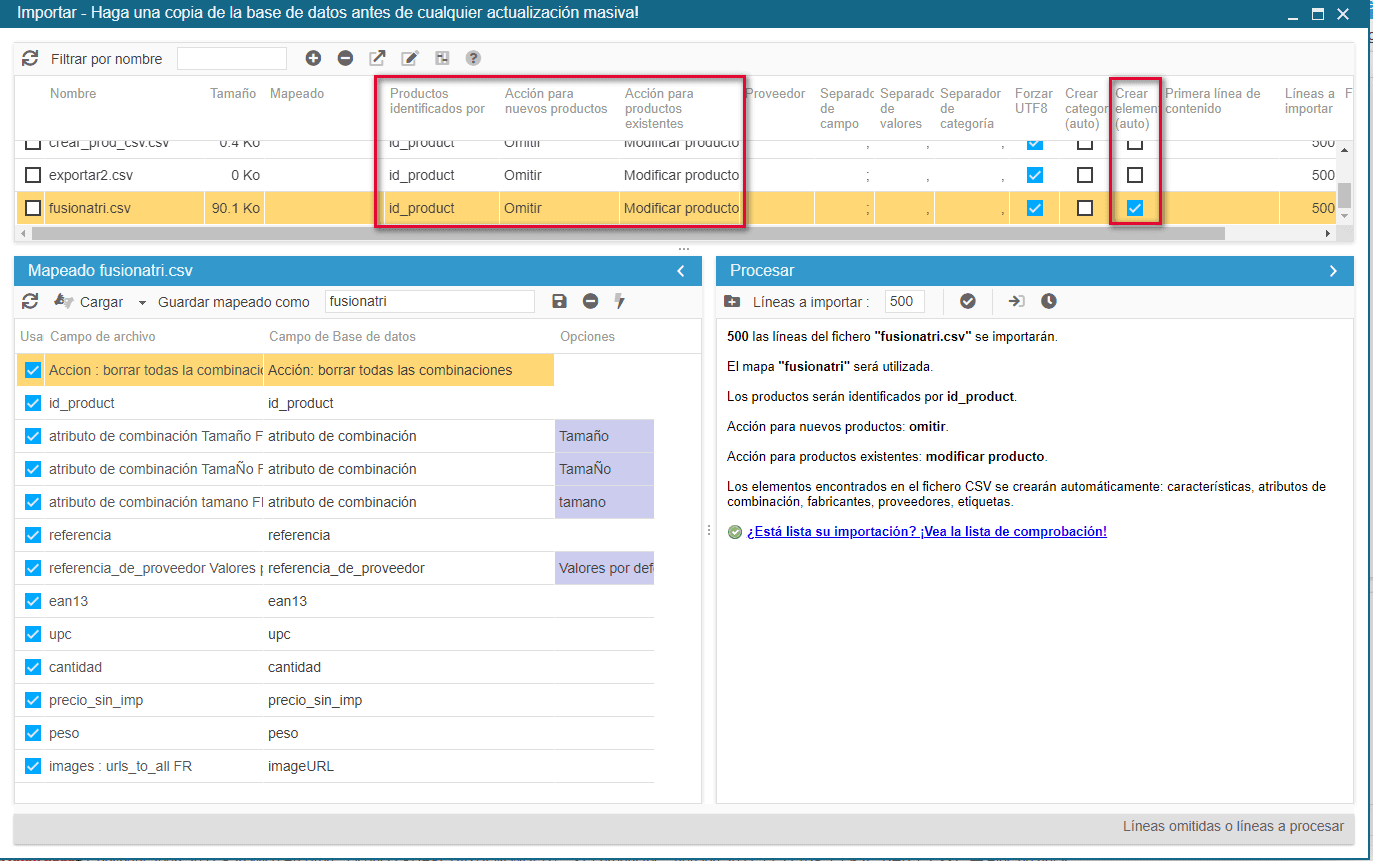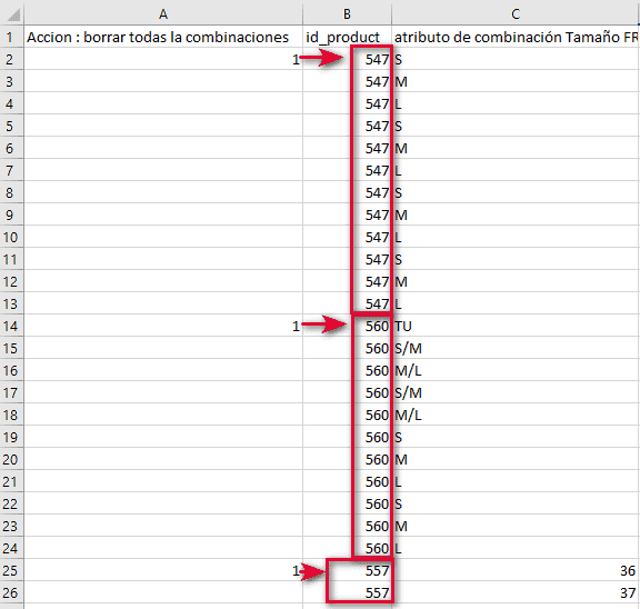 Durante el proceso de importación, las versiones de cada producto indicado en el archivo (detectado por su ID) se suprimirán y AL MISMO TIEMPO las nuevas versiones se crearán con el mismo grupo Talla, y con las mismas informaciones (referencia, cantidad, precio, etc.) que anteriormente.