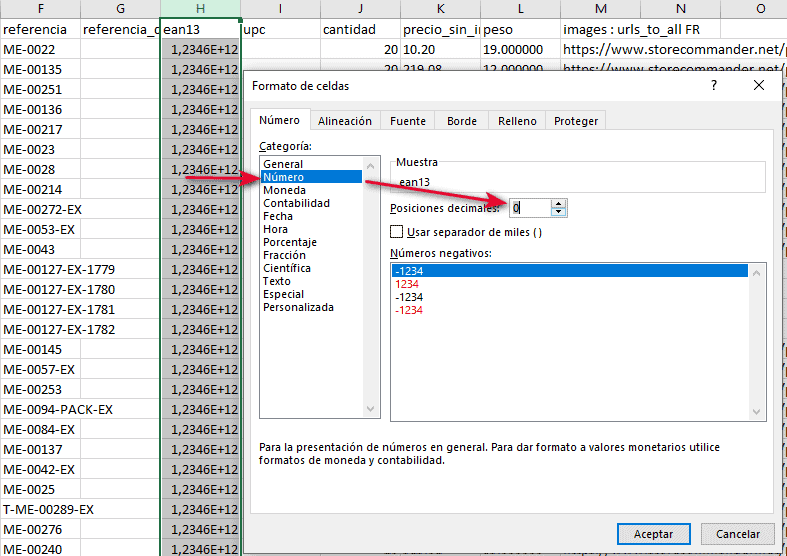 Si tiene códigos ean13 en su archivo, aplique el formato "número + 0 decimales" para que los códigos se muestren correctamente.