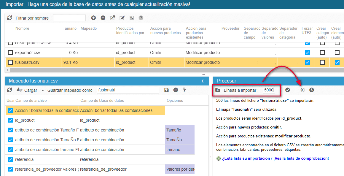 Sustituya el número de líneas "500" por el número de líneas contenidas en su archivo, y ponga en marcha su importación.