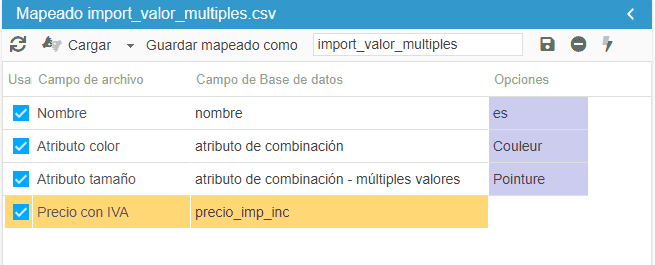 La columna del archivo CSV contiene varios atributos de la combinación que se va a importar en la misma celda. El separador de valor utilizado en la configuración de las opciones de importación deberá corresponderse en el campo apropiado.