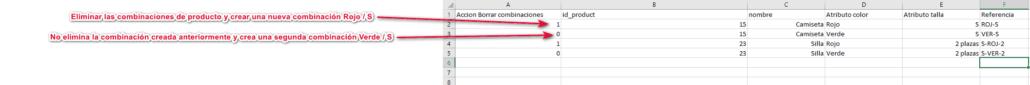 Al generar el archivo de exportación, habrá que añadir una columna al principio del archivo (columna A) llamada "Suprimir las combinaciones". El valor que se deberá utilizar es 1 (para sí) para suprimir todas las combinaciones del producto en cuestión.