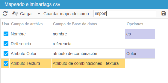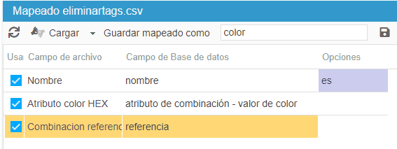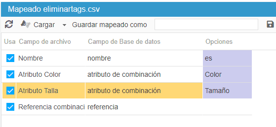 El grupo de atributo correspondiente deberá seleccionarse en la columna Opciones del mapping.