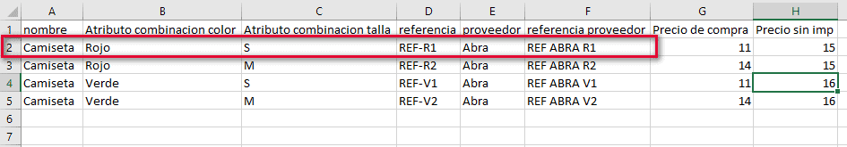 Su archivo CSV contendrá una línea para cada versión La columna referencia contendrá por tanto la referencia para cada una de estas combinaciones.