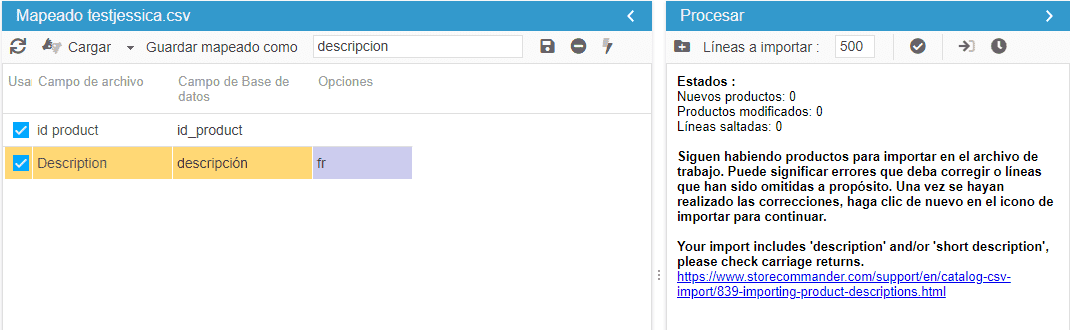 Si ejecuta una importación CSV y los resultados que se muestran son 0,0,0, como se muestra a continuación, significa que una o más columnas de su archivo csv contienen saltos de línea. Normalmente estos saltos de línea se encuentran en las descripciones de los productos, pero también puede haber algunos en otras columnas.