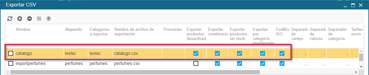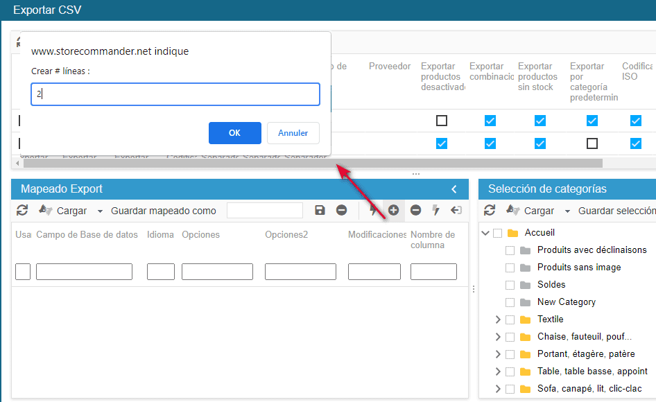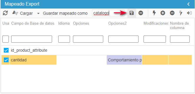 De vuelta al panel principal, rellene las columnas unas después de otras haciendo doble clic: mapping, categorías, nombre del archivo a exportar y las opciones que desee.