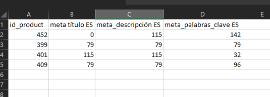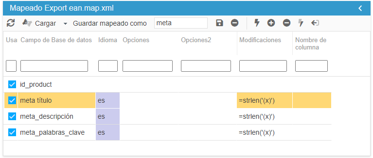 Si desea exportar el tamaño de los campos SEO, meta title, meta description y meta keywords, puede insertar una fórmula en el campo "Modificaciones" de la asignación de exportación, como en la captura de pantalla siguiente.