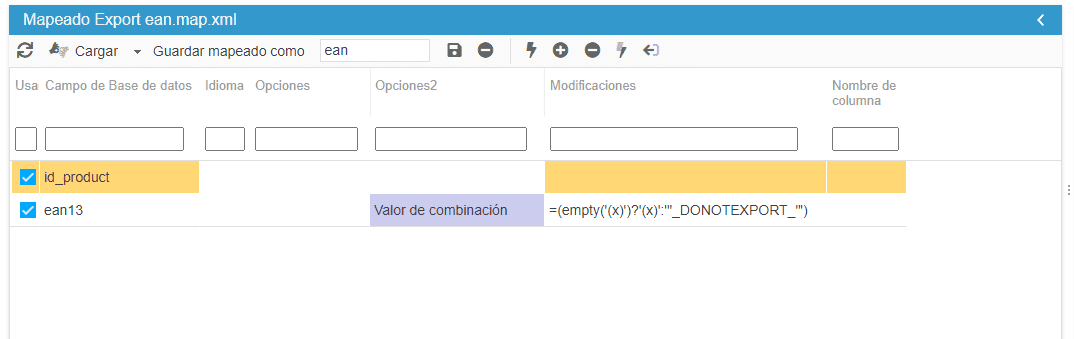 En la columna Modificaciones de tu mapeo de exportación, añade esta fórmula =(empty('(x)')?'(x)':'"_DONOTEXPORT_"') como en la imagen :