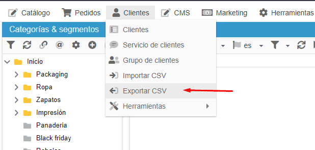 Para acceder a la herramienta de exportación de clientes PRO, vaya a Store Commander > Clientes > Exportar CSV.
