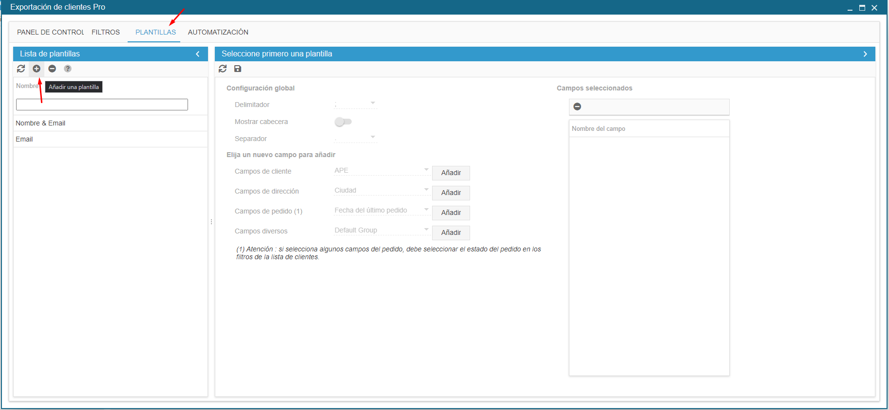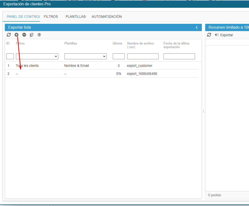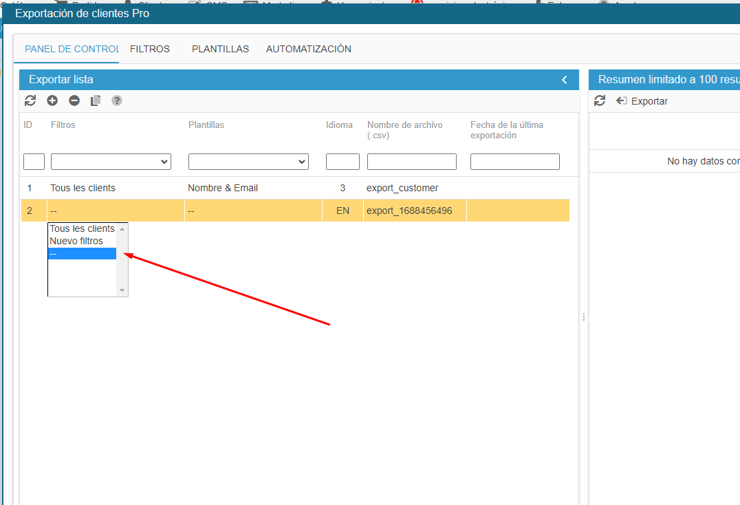 Es en el PANEL DE CONTROL donde elegirá un filtro y una plantilla que definirán su fichero de exportación.