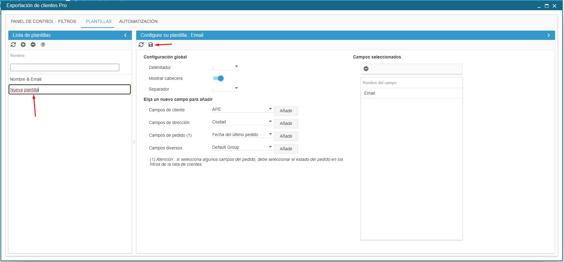 Nombra su plantilla y elige los campos que quiere exportar. Una vez que haya hecho su selección, no olvides guardarla haciendo clic en el bóton