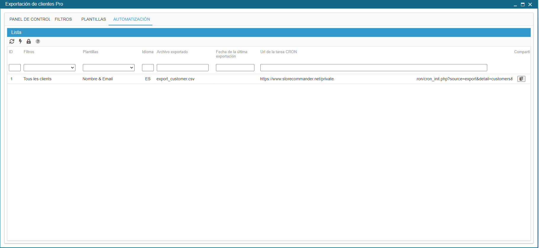 Desde la pestaña AUTOMATIZACIÓN, puede programar exportaciones CSV de sus clientes por tarea CRON.