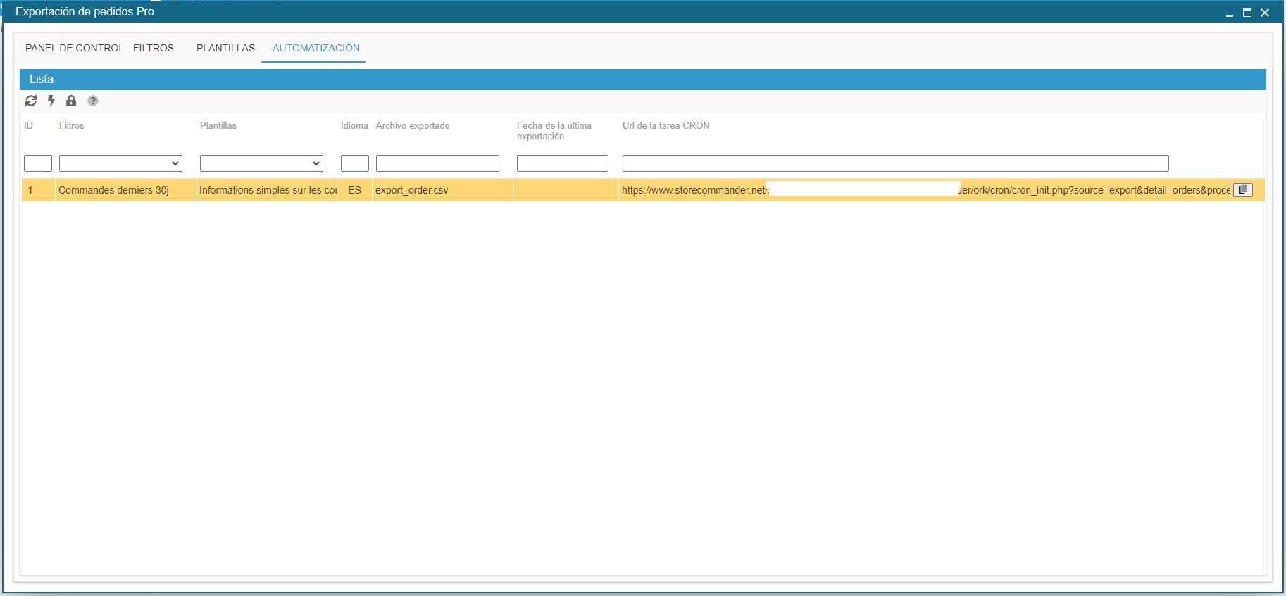 Desde la pestaña AUTOMATIZACIÓN, puede programar exportaciones CSV de sus pedidos por tarea CRON.
