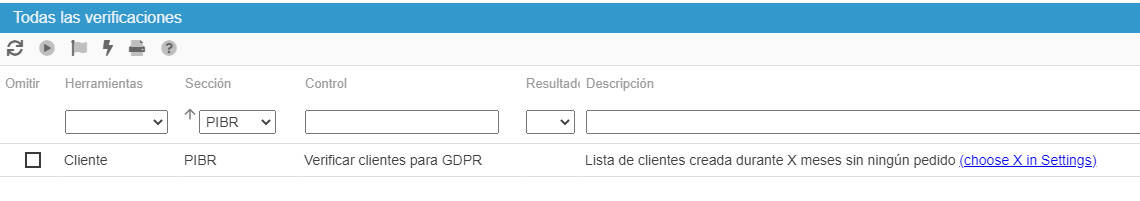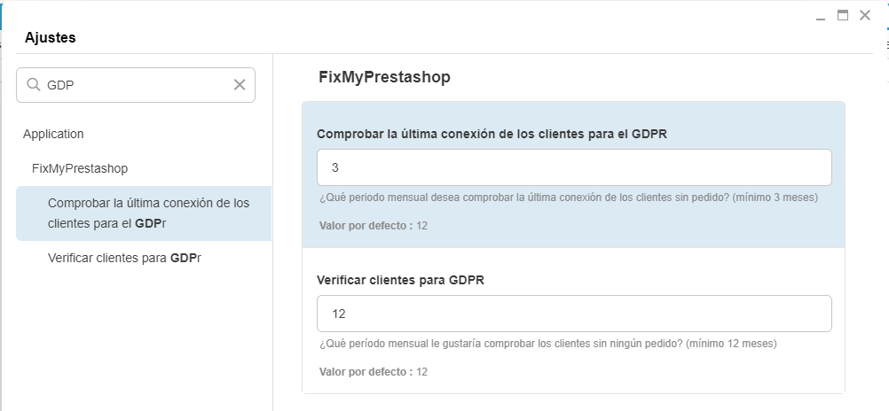 Para establecer el periodo (cuentas creadas hace X meses), vaya a Herramientas > Ajustes > Aplicación > FixMyPrestaShop > Comprobar clientes según FixMyPrestaShop : introduzca el número de meses en la columna Valor