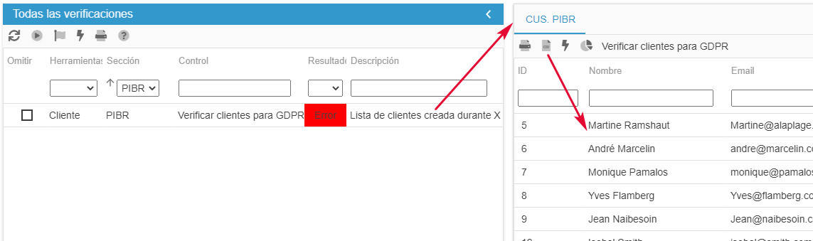 Cuando haya ejecutado esta comprobación y se encuentren clientes, el resultado será "Error" y se mostrará la lista de clientes coincidentes en el panel derecho.
