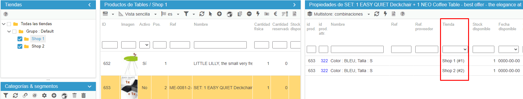 En Sc, puede ver la información de las combinaciones de todas sus tiendas en la cuadrícula de propiedades titulada combinaciones de varias tiendas: