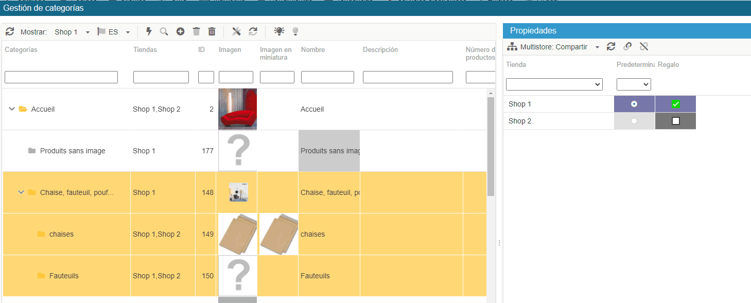 Esta tabla le permite igualmente definir la tienda por defecto de la categoría seleccionada.