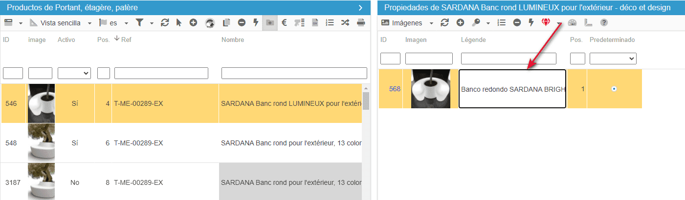 Para modificar rápidamente el texto de las imágenes en Store Commander, muestre la tabla de las imágenes (columna de las Propiedades a la derecha) y haga doble clic en la celda para editarla, después de haber seleccionado un producto previamente.