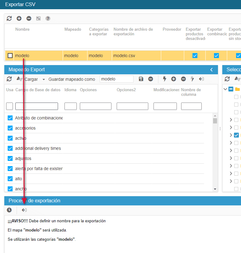 -> en la columna Nombre del archivo a exportar, haga doble clic para introducir el nombre de su archivo, del tipo 'modelo.csv' (¡no olvide .csv!)