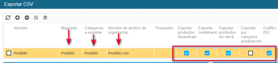 -> deje marcadas todas las otras casillas salvo "Exportar por categoría por defecto"