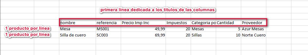 Para empezar, asegúrese de que el archivo CSV contenga los títulos de las columnas, así como un único producto por línea.