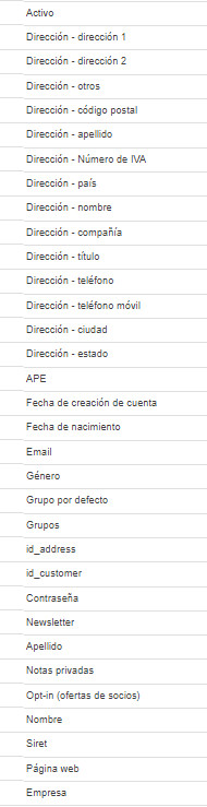 Aquí está la lista de campos disponibles: