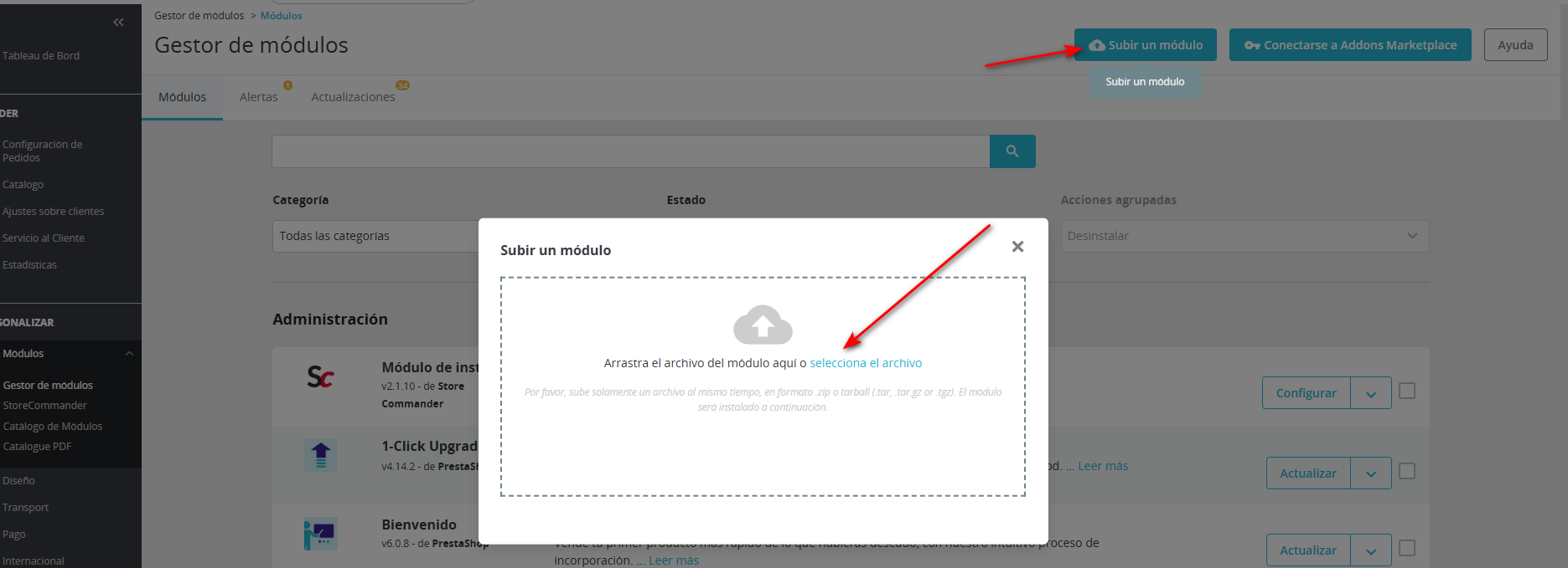 En su backoffice PrestaShop > Módulos, haga clic en «Añadir/Instalar un módulo» en la parte superior derecha de la página.