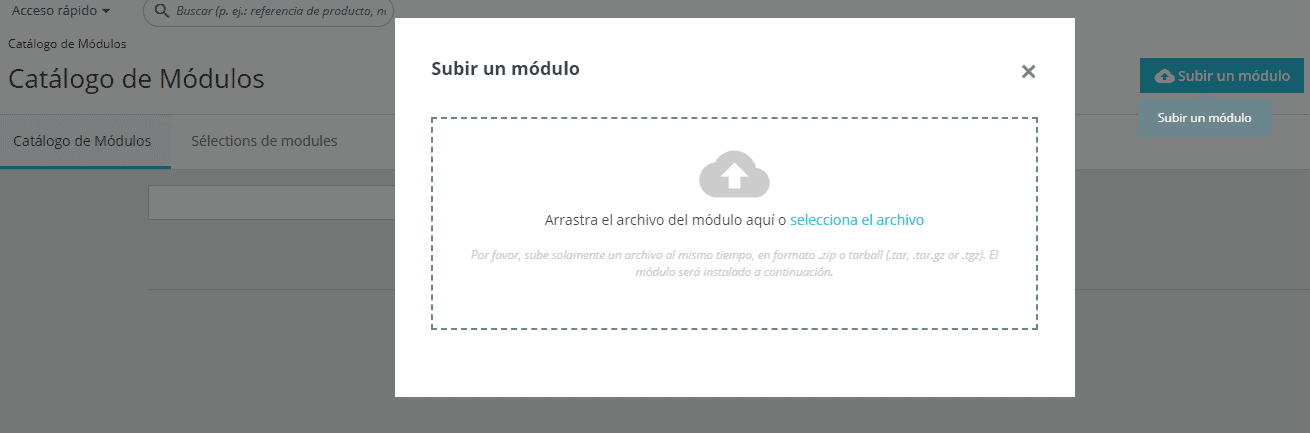 En el menú Módulos del backoffice de PrestaShop, haga clic en «Agregar», seleccione el archivo sc.zip y cárguelo.