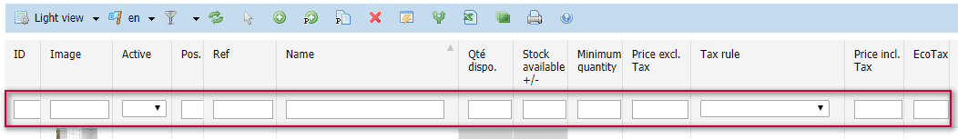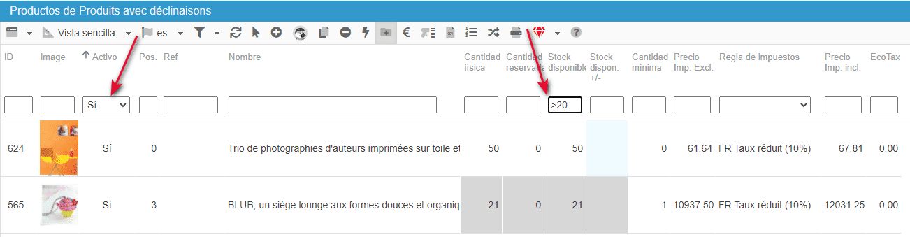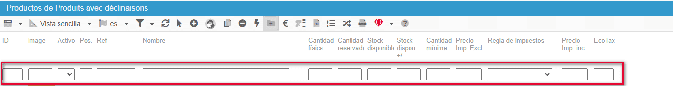 Aquí, la línea de filtro de la vista rápida en la interfaz de Productos: