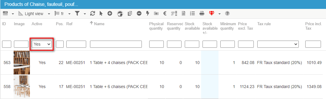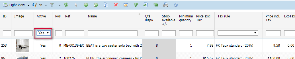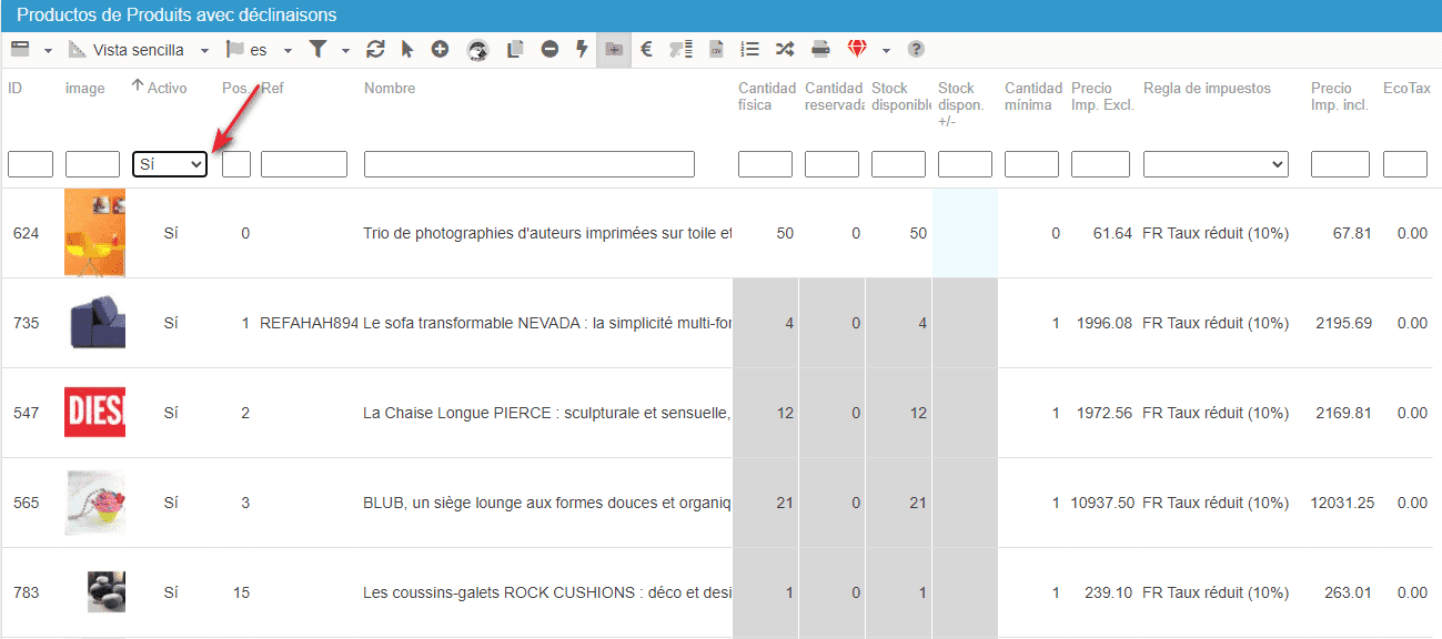 Puede filtrar la lista de productos para mostrar sólo los productos activados, por ejemplo, seleccionando "sí" en el menú desplegable de la columna Activo: