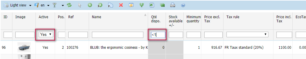 Todos los filtros son acumulativos, por lo que también puede utilizar el filtro "Cantidades disponibles" para mostrar los productos activados con menos de 1 en stock, por ejemplo: