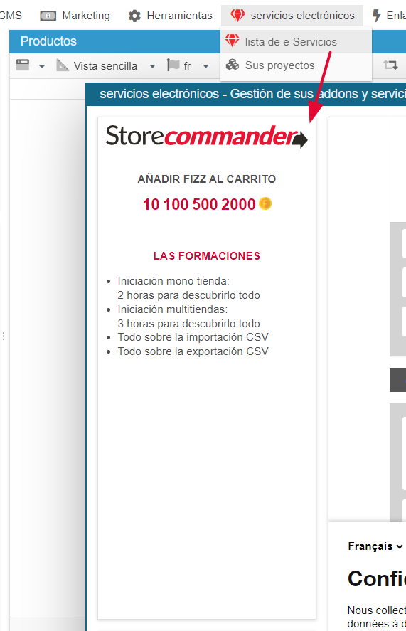 Puede comprar Fizz directamente desde la interfaz de Store Commander, menú Servicios online > Lista de servicios online