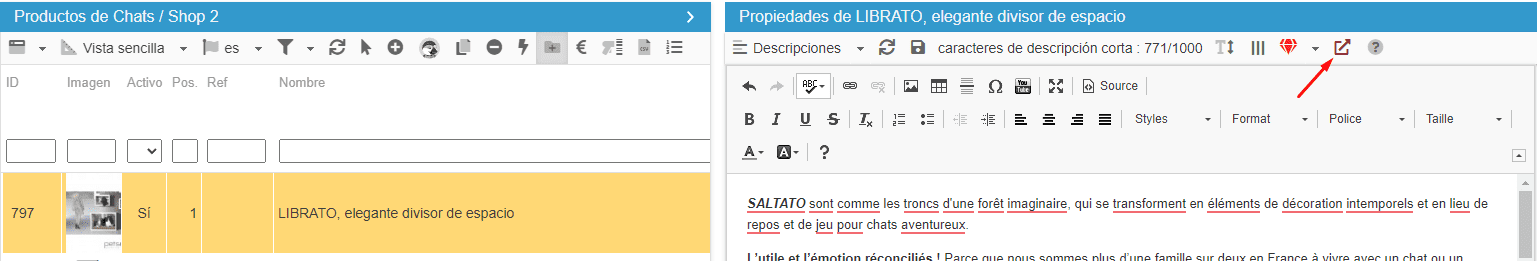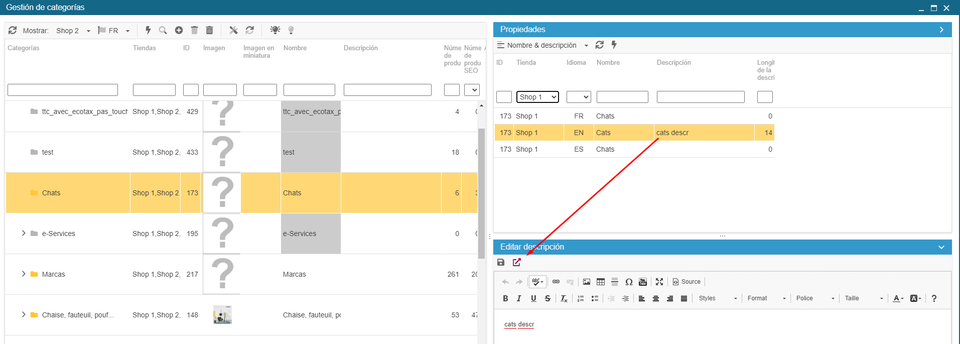 En la interfaz dedicada a las categorías (menú Catálogo > Categorías), encontrará el icono en el panel Descripción en la parte inferior derecha cuando se seleccione una categoría: