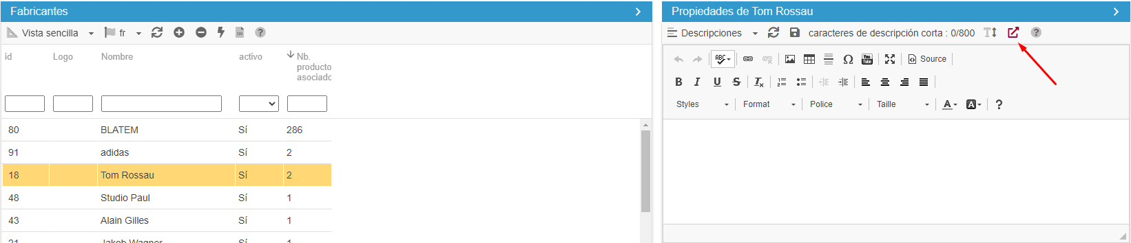 En la interfaz dedicada a los/las fabricantes/marcas (menú Catálogo > Fabricantes), el acceso directo se encuentra en la barra de herramientas Descripciones de un fabricante seleccionado:
