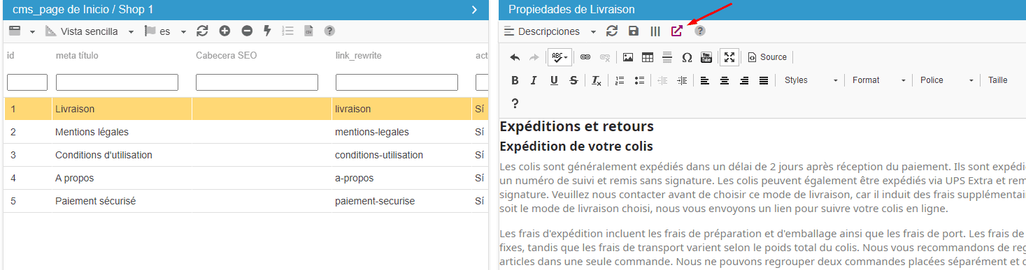 En la propiedad CMS Page Descriptions, en la interfaz dedicada, menú CMS en la barra principal de Sc :