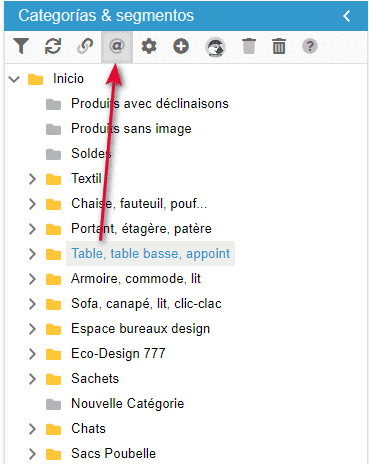 Para saber qué productos (mostrados en la columna central) utilizan la categoría seleccionada por defecto, active la opción en la barra de herramientas de las categorías ![]()