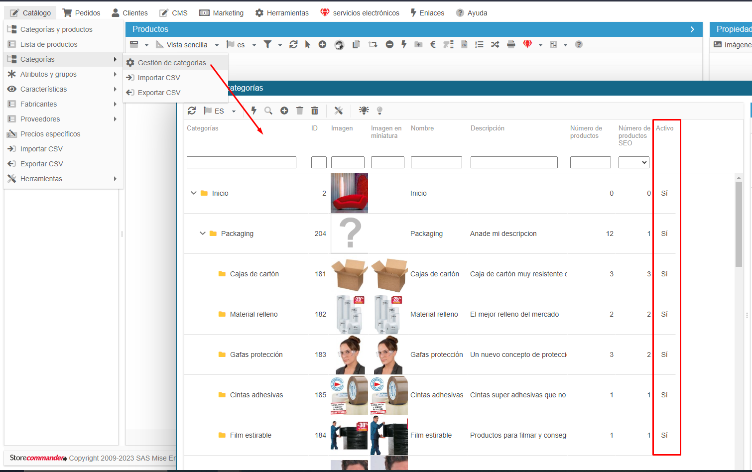 En la columna izquierda de la estructura de árbol hay una columna 'Activa', que mostrará Sí/No: categoría activada o desactivada en su sitio.
