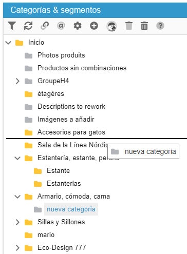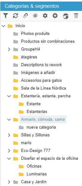 Con la arborescencia de las categorías de Store Commander, puede acceder visualmente a todas las categorías y subcategorías de su catálogo simplemente haciendo clic en los signos "más" y "menos" al lado de las categorías mostrándolas y ocultándolas.