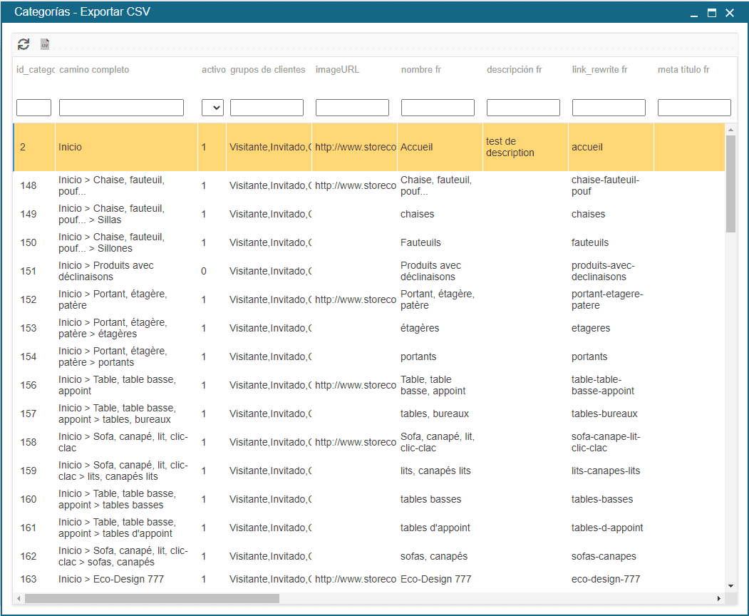 La ventana de exportación muestra por defecto la lista de todas sus categorías, por orden de sus ID, en todos los idiomas, y todas las tiendas combinadas si está trabajando en modo multitienda.
