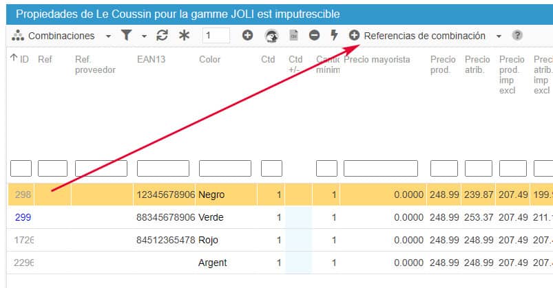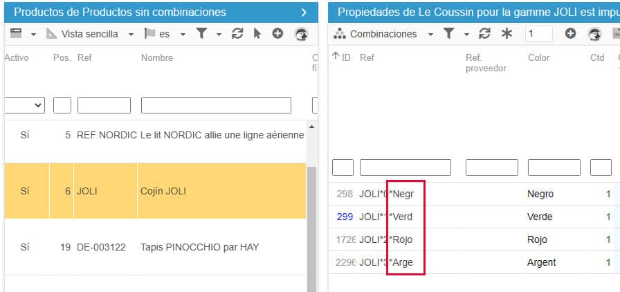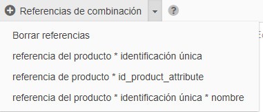 La referencia generada utilizará la referencia del producto padre + 0 (número que se incrementará 1, 2, 3, etc.) + nombre del atributo (primeros 4 caracteres)