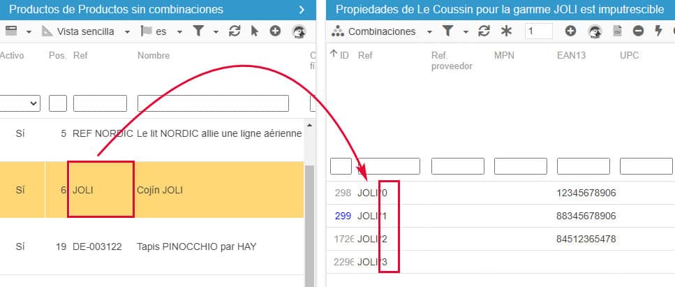 La referencia generada utilizará la referencia del producto padre + la ID de la variación.