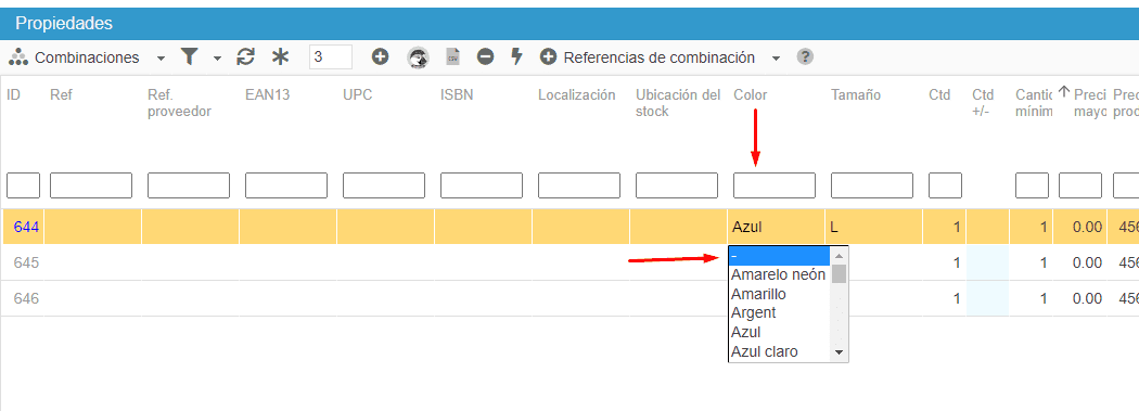 Para ello, vaya a la propiedad (panel derecho) > combinaciones y proceda como sigue: