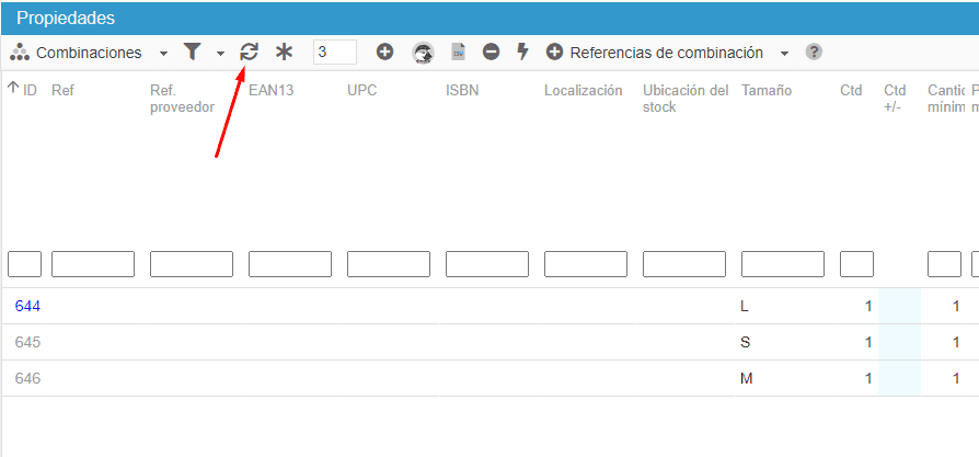 2- Actualizar la propiedad > Combinaciones. El grupo de colores ha sido eliminado de mis Combinaciones.
