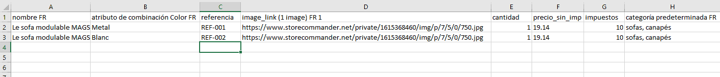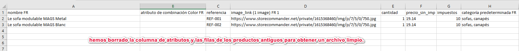 Tenga presente que en la exportación puede incluir otros campos que desee transmitir a los nuevos productos, como fabricante, proveedor, SEO, etc.