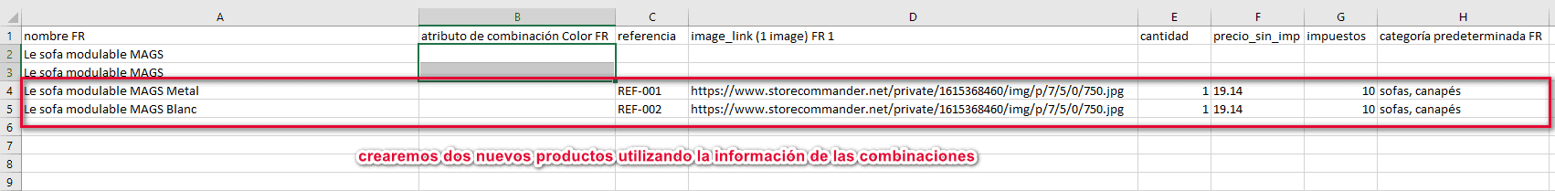 La exportación incluirá los campos de las versiones: atributos, referencias, precios, imágenes y cualquier otra información que desee transmitir a los nuevos productos.