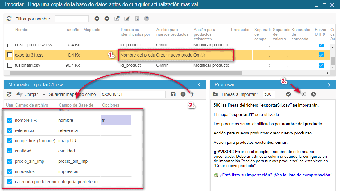 Para crear estos 3 nuevos productos, cargamos el archivo csv en la ventana de import de Sc