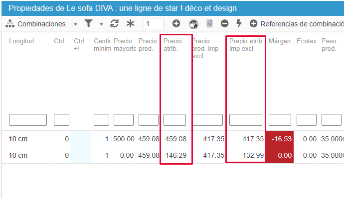 Puede aumentar el precio de sus combinaciones editando el campo 'Precio atrib. imp excl" o "Precio atrib." en la cuadrícula de combinaciones.