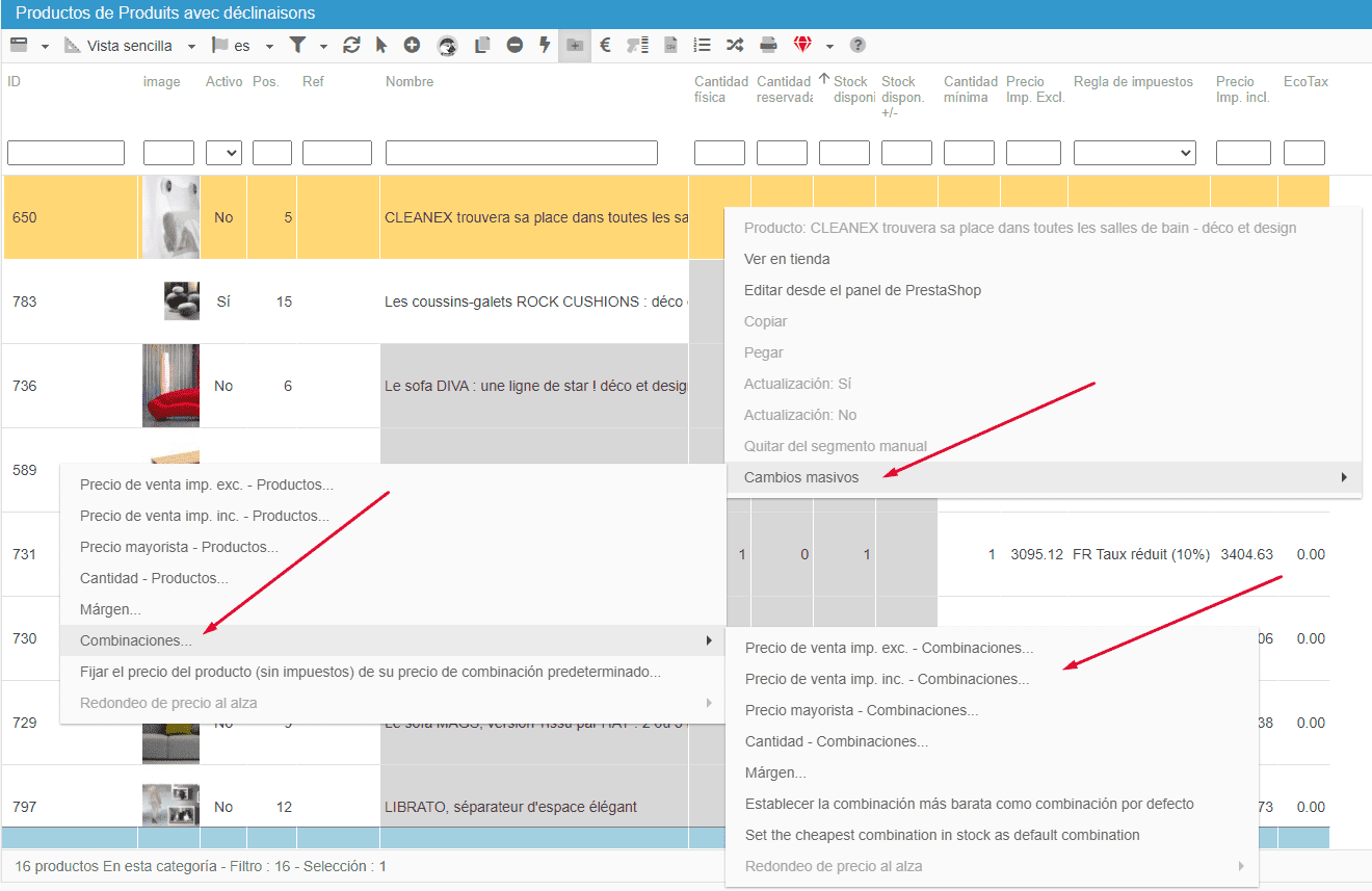 Seleccione los productos en cuestión en la columna central > haga clic con el botón derecho para mostrar el menú contextual > Cambios masivos > Combinaciones > Precio imp. exc. o Precio imp. inc.