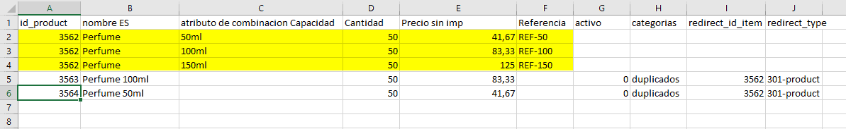 Modificamos su nombre y le añadimos las 3 versiones de Contenido en una nueva columna (y cualquier otra información que desee añadir a estas nuevas combinaciones, como la referencia, el stock, el precio)